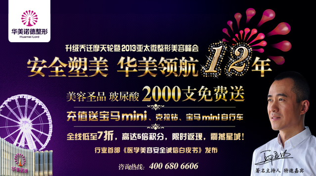 峰会召开时期,正值华美诺德医学美容乔迁升级摩到轮之际。为了践行峰会诚信行医、安全塑美的宗旨,让更多的求美者安全塑美,华美诺德医学美容医院将全新升级,1万平米的超规模医疗面积,斥巨资引进世界一流设备,整形外科、激光美肤、无创注射、中医美容、SPA、生活美容等科室一应俱全,每天都有中国、日本、韩国、泰国等国际顶级专家亲诊,保障顾客在绝对安全的环境下,轻松实现美丽梦想。